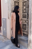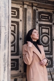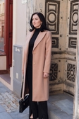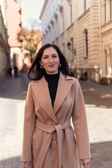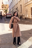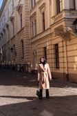Długość produktu sięga do połowy łydki. Kołnierzyk typu marynarka. Zapinany centralnie na dwa guziki. Linia ramion jest nachylona z naturalną szerokością, poduszka naramienna nadaje tej linii wyrazistości. Do płaszcza dołączony jest pasek bez klamry, który jest wiązany w talii.